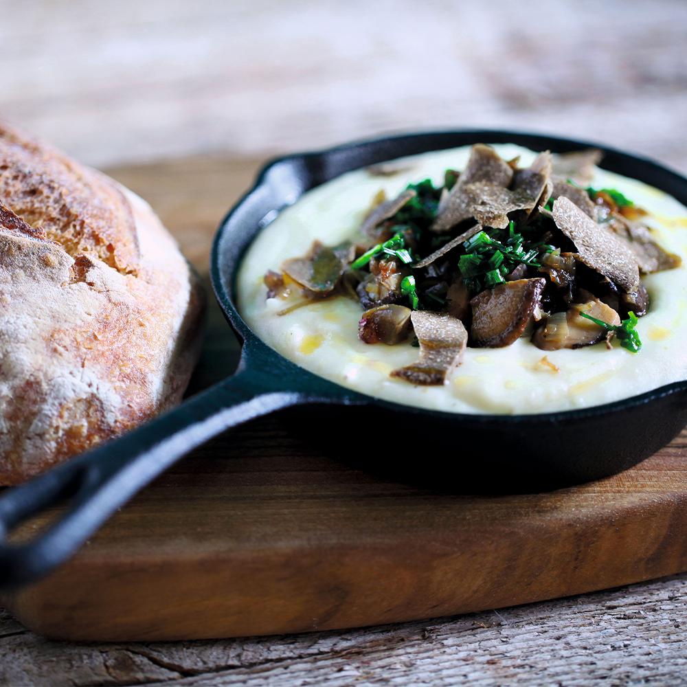 Des pommes de terre écrasées comme à la fourchette, crémées, beurrées et agrémentées de brisures de truffes d’été dites « truffes de la Saint-Jean ». Une recette gourmande et savoureuse avec un parfum délicat de truffe.